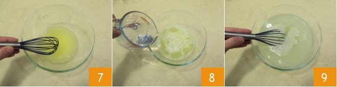 Después de mezclar bien, para que el azúcar se disuelva 7, añade también el agua 8 y sigue mezclando 9.