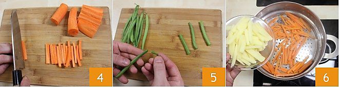Mientras tanto, preparad la verdura que os servirá para acompañar la lubina: limpiad 2 zanahorias, el calabacín y las patatas y cortad todo en bastoncillos 4, para más detalles sobre el corte de las verduras haced clic aquí (Cómo cortar las verduras). Eliminad los extremos de las judías verdes 5 y colocad las verduras en la vaporera: primero las zanahorias y las patatas 6, cocinad durante un par de minutos y