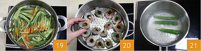 Cuando las verduras estén cocidas 19, sacadlas de la vaporera y en su lugar colocad los medallones de lubina 20, salpimentad y cocinad durante 10 minutos cubriendo con una tapa. En un cazo verted un poco de agua, llevad a ebullición y escaldad durante un par de minutos los tallos de cebollino que habéis reservado 21.