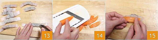 Con unas pinzas especiales, eliminad todas las espinas presentes en la carne, pasad el yema del dedo sobre la superficie del pescado para identificarlas más fácilmente 13. Luego tomad la zanahoria sobrante y con la ayuda de una mandolina cortadla en "cintas", es decir, en rebanadas muy finas a lo largo 14. Colocad las rebanadas así obtenidas sobre cada filete de pescado 15 que habréis salado previamente en la superficie,