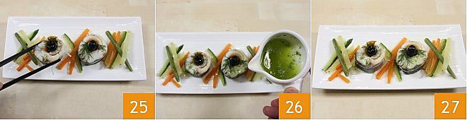 encima de la zanahoria colocad una ramita de eneldo o perejil picado 16, doblar los extremos de los filetes hacia el centro, cerrad el pequeño medallón obtenido con un trozo de hilo de cocina 17 y asegurad el hilo con un doble nudo. Una vez que tengáis todos los medallones, colocad en el centro de cada uno una aceituna negra deshuesada 18.