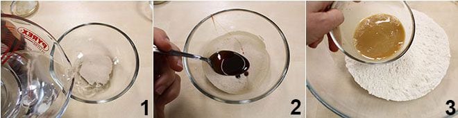 Para preparar los maritozzi, disuelve la levadura deshidratada (o 12 gr de levadura fresca) en un poco de agua tibia 1, añade una cucharadita de malta 2 y mezcla bien. Coloca la harina de manitoba en un bol, junto con el azúcar, formando un hueco en el centro en el que verterás la levadura y la malta disueltas juntas 3, que mezclarás un poco con la harina.
