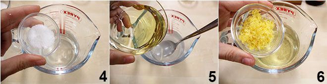 En el agua tibia restante, vierte la sal 4, el aceite de semillas 5 y la ralladura de limón 6 y mezcla.