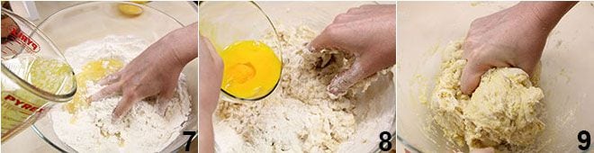 Vierte el líquido obtenido en hilo sobre la harina y amasa con las manos, haciendo movimientos amplios y rápidos 7. Mientras tanto, separa las yemas de las claras, que reservarás, y añade solo las yemas a la masa 8. Continúa amasando 9, al menos durante 6-7 minutos, hasta que la mezcla esté bien compacta.