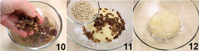 Mientras tanto, pon a remojar las pasas en agua fría durante 10 minutos 10, escúrrelas o déjalas escurrir en un colador y sécalas con un paño. Añade las pasas, los piñones 11 y la naranja confitada (o la ralladura de 1 naranja) a la masa y continúa amasando para que los piñones, las pasas y la naranja se integren en la masa. Coloca la masa de los maritozzi en un bol enharinado 12, cubierto con film y deja que fermente durante al menos 2 horas en un horno cerrado y apagado (puedes dejar solo la luz encendida para acelerar la fermentación).
