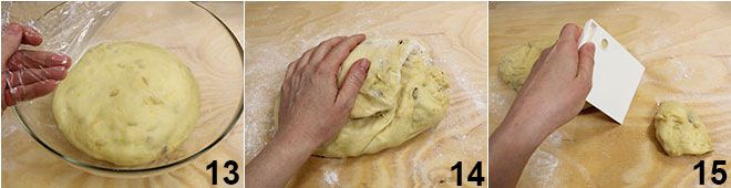 Cuando la masa de los maritozzi haya duplicado su volumen 13, transfiérela a una superficie de trabajo enharinada y divídela en 12 piezas de un peso de aproximadamente 85-90 gr cada una (14-15).
