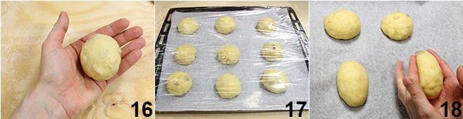 Da a cada pieza una forma redonda bien cerrada por debajo 16, colócalas en una bandeja para horno forrada con papel de horno y cúbrelas con film 17, dejándolas fermentar durante media hora. Pasado este tiempo, dales una forma un poco alargada 18