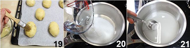 y pincélalas con las claras que habrás reservado 19. Cúbrelas nuevamente con film y déjalas fermentar por última vez durante una hora. Mientras los maritozzi fermentan, prepara el jarabe de azúcar, que servirá para pincelar, poniendo en un cazo el azúcar y el agua 20. Disuelve bien el azúcar hasta que el líquido se vuelva transparente 21 y déjalo enfriar. Ahora que los maritozzi han terminado de fermentar, hornéalos en un horno precalentado a 180 grados durante 18 minutos.