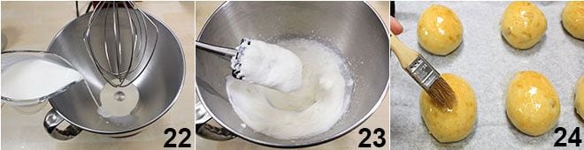 Monta también la nata a punto de nieve en un robot de cocina junto con el azúcar glas (22-23). Cuando tus maritozzi estén bien dorados en la superficie, sácalos del horno y aún calientes, píntalos con el jarabe de azúcar 24.