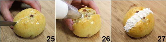 Una vez enfriados, haz un corte en el centro de cada maritozzo 25 y rellena cada uno con copos de nata montada que habrás transferido a una manga pastelera (26-27). ¡Lista para ser servida (y devorada) tus maritozzi!