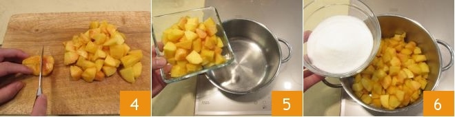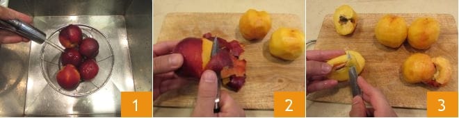 Para preparar la confitura de melocotón comienza eligiendo la fruta: toma melocotones bien maduros y de pulpa firme, lávalos bajo el agua corriente 1, pélalos 2 y quita el hueso 3.
