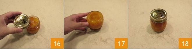 Atornilla bien las tapas 16, pero sin apretar demasiado, y déjalos enfriar. Puedes darles la vuelta 17 o evitar este paso: gracias al calor se formará de todos modos el vacío, que permitirá que el producto se conserve durante mucho tiempo. Una vez que los tarros se hayan enfriado, verifica si el vacío ha ocurrido correctamente: puedes presionar en el centro de la tapa y, si no escuchas el clásico "click-clack", el vacío habrá ocurrido 18. ¡Tu confitura de melocotón está lista para ser disfrutada!