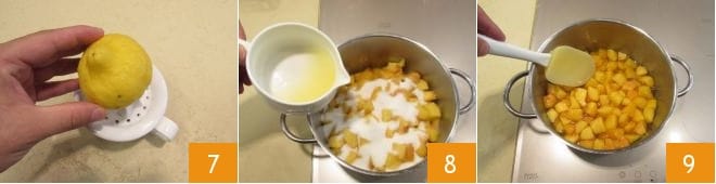 Exprime un limón 7 y agrega el jugo en la cacerola 8. Mezcla 9 y deja macerar por un tiempo no inferior a 7 horas pero que no supere las 12 horas.