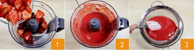 Para preparar los merengues con frutos rojos, comenzad limpiando la fruta. Laváis bajo agua corriente las frambuesas y las fresas, luego quitad a estas últimas las hojitas verdes ayudándoos con un cuchillo y divididlas por la mitad. Luego vertéis en la batidora las frambuesas y las fresas 1, accionáis la batidora para licuar la fruta hasta obtener una pulpa homogénea 3. Luego filtradla con un colador de malla fina, ayudándoos con una espátula o una cuchara para recoger la pulpa colada en un bol pequeño 3. La pulpa así recogida deberá tener un peso de unos 75 g.