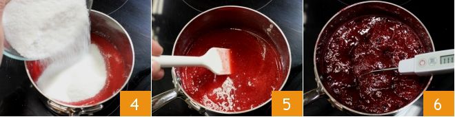 Luego pasadla a un cazo, añadid 100 g de azúcar 4 y encended el fuego, mezclando para disolver el azúcar 5. Lleva la pulpa a 121° 6 monitoreando la temperatura con un termómetro para alimentos. Cuando el jarabe haya llegado a 115°, comenzad a batir las claras.