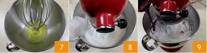 Vertéis las claras en el bol de una batidora de pie 7 y accionad las varillas (si no tenéis batidora de pie, podéis utilizar una batidora eléctrica). Cuando estén semi montadas, con las varillas aún en funcionamiento añadid 25 g de azúcar 8. Batid aún para incorporar el azúcar, luego cuando el jarabe haya alcanzado los 121° añadidlo en hilo a las claras montadas 9 continuando haciendo funcionar las varillas, hasta crear una mezcla espumosa homogénea y completamente fría.