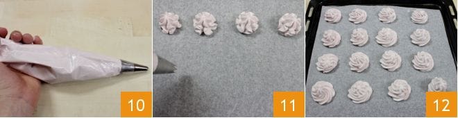 Cuando la crema esté lista, transferidla a una manga pastelera con boquilla de estrella 10. Cubrid una bandeja con papel de horno y comenzad a crear montoncitos de merengue espaciados un par de cm entre sí 11. Cuando hayáis terminado toda la masa 12, coced en horno estático a 100° durante 3 horas, hasta que los merengues estén firmes y ligeramente coloreados por debajo. A diferencia del merengue clásico francés, este merengue sigue siendo un poco suave por fuera y crujiente por dentro.