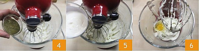añade también la pasta de pistacho 4, el yogur 5, los huevos uno a uno 6 y una pizca de sal. Cuando los huevos se hayan mezclado con la mezcla