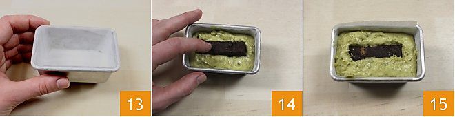 Forra una bandeja rectangular de 15x10 cm con papel de horno y vierte dentro la mezcla de pistacho y Nesquik nivelándola bien con una espátula 10. Hornea en horno estático ya caliente a 170° durante 20 minutos (o en horno ventilado a 150° durante 15 minutos). El resultado deberá ser una tarta muy suave y húmeda por dentro con una corteza crujiente 11. Deja enfriar la tarta (para facilitar el corte puedes ponerla 20 minutos en la nevera) y luego córtala en bastoncillos de 6x2 cm 12: de este modo tendrás el corazón de tus mini plumcakes.