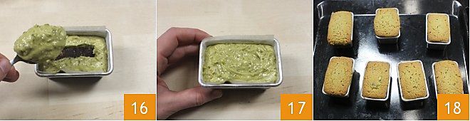 y cubre todo, hasta el borde, con más mezcla de pistacho (16-17). Hornea en horno estático precalentado durante 35 minutos a 170° (o en horno ventilado durante 25 minutos a 150°) hasta que la superficie de los plumcakes empiece a dorarse ligeramente 18. Saca los mini plumcakes de pistacho con corazón de Nesquik, déjalos atemperar y disfrútalos!