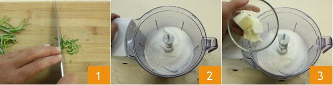 Para realizar la mini tatin de setas, comienza preparando primero la brisé: pica las hierbas 1, pon en un procesador de alimentos con cuchillas la harina 2, la mantequilla 3