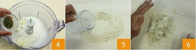 y las hierbas picadas 4, acciona el procesador hasta obtener una masa arenosa. Añade la sal y transfiere la masa a una superficie de trabajo, forma el clásico volcán y añade en el centro el agua helada 5. Amasa enérgicamente a mano 6
