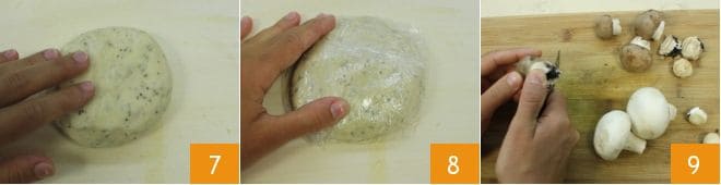 hasta obtener un bloque compacto 7. Envuélvelo en film 8 y déjalo en el frigorífico para que se solidifique durante al menos 40 minutos. Mientras tanto, limpia las setas porcini y champiñones para eliminar los residuos de tierra presentes en la superficie 9.