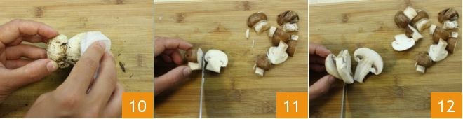 y limpieza y corte de los champiñones 10. Una vez limpios, corta las setas más pequeñas por la mitad 11 y las más grandes en rodajas 12.