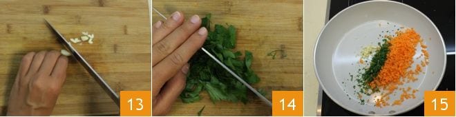 Prepara un picadillo con la zanahoria, el ajo 13 y el perejil 14, coloca el picadillo obtenido en una sartén 15, añade la mantequilla y sofríe.
