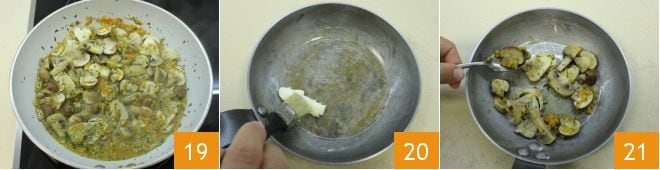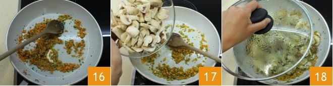 Deja cocinar unos minutos 16 y luego añade las setas 17, salpimienta y continúa la cocción durante 10 minutos con la tapa 18.