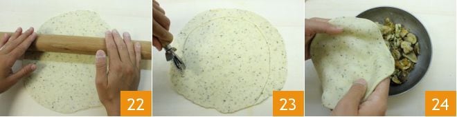 Extiende la brisé 22 y corta con una rueda cortapastas 4 discos de un grosor de aproximadamente medio cm y con un diámetro de aproximadamente 16 cm 23, coloca los discos sobre las setas 24