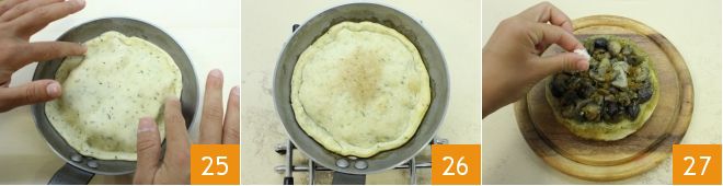 presionando suavemente en los bordes 25. Hornea en horno estático a 180° durante 25 minutos (o en horno ventilado a 160° durante 20 minutos). Desmolda 26, voltea rápidamente sobre un plato de servir o una tabla de cortar y espolvorea con queso Grana Padano rallado 27, ¡tus mini tatin de setas están listas para ser disfrutadas!