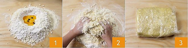 Para preparar las minne de Santa Águeda, amasa la masa quebrada (aquí más indicaciones): en una superficie plana vierte la harina que habrás mezclado en un procesador con la mantequilla fría, añade el azúcar glas, las yemas de los huevos (reserva las claras, para el glaseado), las semillas de una vaina de vainilla 1 y amasa 2 con las manos, para obtener una mezcla homogénea. Envuelve la masa quebrada en un papel film y déjala reposar en el frigorífico durante al menos media hora 3.