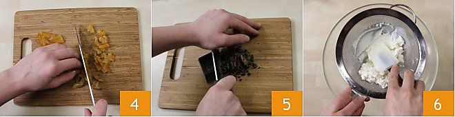 Procede con la preparación del relleno: corta en trocitos la naranja confitada 4 y reduce en escamas el chocolate negro 5. Tamiza muy bien la ricotta, pasándola a través de un colador 6 y