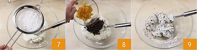 une el azúcar glas también tamizado 7 luego mezcla los ingredientes. Añade los trozos de naranja confitada y el chocolate 8; finalmente, si deseas un aroma más afrutado, añade también la ralladura de una naranja. Mezcla todo para obtener una mezcla homogénea 9.