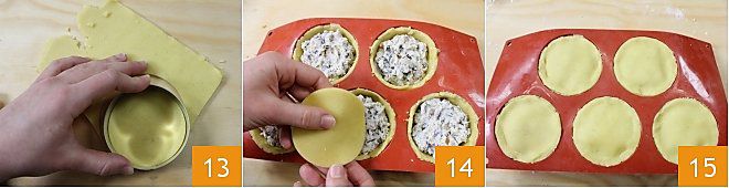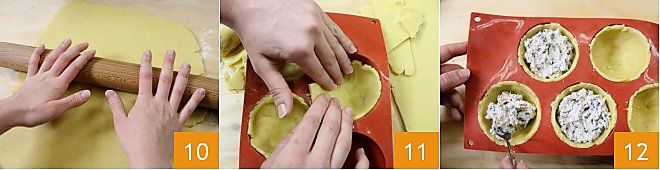 Retoma la masa quebrada y extiéndela, con la ayuda de un rodillo, en una hoja de aproximadamente medio cm de grosor 10 y fórrala con moldes semiesféricos 11 (hemos utilizado moldes de silicona de 8 cm de diámetro, capacidad 115 ml), luego rellénalos con aproximadamente 80 gr de ricotta 12.