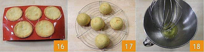 Hornea todo, en horno estático ya caliente, a 200° durante 20 minutos (horno ventilado 180° durante 15 minutos). Cuando las minne se hayan dorado en la superficie, sácalas del horno y déjalas enfriar en los moldes 16, luego desmóldalas cuando estén completamente frías (de lo contrario, el relleno caliente no se sostendrá). Colócalas sobre una rejilla y mientras tanto prepara el glaseado: monta las claras con las varillas de una batidora eléctrica o una amasadora 18,