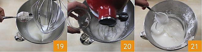 cuando la mezcla esté semimontada añade el azúcar glas, una cucharada a la vez y por último el zumo de limón (19-20). La consistencia del glaseado no debe ser demasiado espesa y brillante, sino que, como se dice en el argot, debe "escribir" 21, es decir, debe dejar un rastro al caer desde arriba.