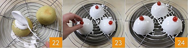 Cubre bien las minne con el glaseado, dejándolo deslizar uniformemente sobre el dulce 22, luego termina la decoración con una cerecita confitada colocada en la parte superior de cada postre 23. Deja secar sobre la rejilla, para que caiga el exceso de glaseado 24. Las minne de Santa Águeda están listas: se pueden consumir cuando el glaseado aún está blando o dejarlo secar completamente 24.