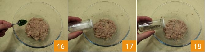 Sazona con la nuez moscada 13 y el queso rallados 14. Mezcla enérgicamente con las manos para amalgamar bien todos los ingredientes 15.
