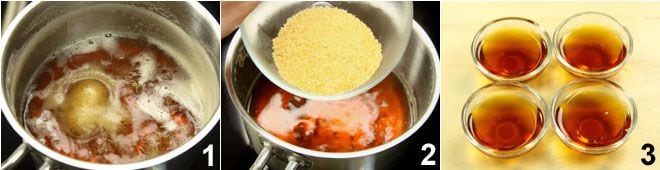 Para preparar la mousse de avellana y corazón a los 5 lúpulos, empieza preparando el corazón de gelatina de cerveza: deja en remojo durante 10 minutos las hojas de gelatina en agua fría, mientras tanto, en un cazo, lleva a ebullición la Bock Roja a los 5 lúpulos de la Cervecería Angelo Poretti y haz que se reduzca a un tercio 1. Luego añade el azúcar moreno 2 y las hojas de gelatina bien escurridas y hazlas disolver. Pon la mezcla obtenida en pequeños recipientes de unos 3 cm de diámetro 3 (alternativamente, puedes usar bandejas de hielo) y deja solidificar en la nevera durante al menos 2 horas.