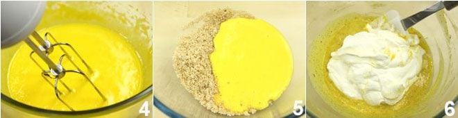 Ahora prepara la crema inglesa: en una cacerola, lleva la leche a ebullición con la vaina de vainilla en infusión, añádela a las yemas batidas con el azúcar 4, mezcla bien y cocina al baño maría hasta que la crema alcance los 82 grados. Luego filtra la crema para eliminar posibles grumos y cuando esté tibia, únela a las avellanas que habrás triturado con una cucharadita de azúcar hasta reducirlas a un polvo finísimo 5. Haz disolver la gelatina previamente remojada en agua fría y escurrida y añade la nata montada, incorporándola delicadamente para no desmontarla 6.