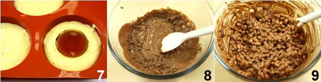 Vierte entonces la mezcla en moldes semiesféricos de unos 6 cm de diámetro, llenándolos hasta la mitad. Luego coloca dentro la gelatina solidificada 7 y cubre con más mousse, hasta llenar los moldes. Deja reposar en la nevera durante otras 4 horas. Derrite en el microondas ¾ de la tableta de chocolate con leche y añade el resto finamente picado, mezclándolo hasta que se disuelva 8; luego añade el arroz inflado y mezcla todo 9.