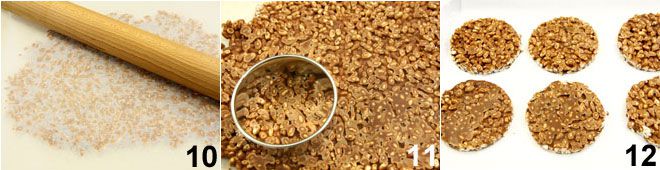 Distribuye la mezcla con una cuchara entre dos hojas de papel de horno, extiéndela bien y nivélala con la ayuda de un rodillo 10 y deja que se solidifique colocándola en el frigorífico durante unos 30 minutos; luego, con un cortapastas en forma de anillo, saca formas circulares del mismo tamaño que la mousse 11, obtendrás círculos de chocolate y arroz inflado que adornarán la mousse 12. A este punto, puedes montar la mousse de avellana y corazón a los 5 lúpulos colocando el círculo de chocolate y arroz inflado en el centro del plato, luego desmolda la mousse sobre él y decora con frutos del bosque variados y trocitos de avellana!