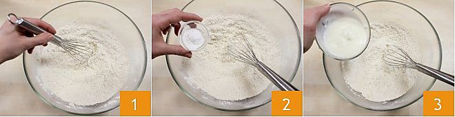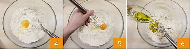 después romped los huevos y añadidlos 4, luego mezclad con la varilla 5. Finalmente, verted en hilo el aceite de oliva virgen extra 6 y mezclad bien los ingredientes.