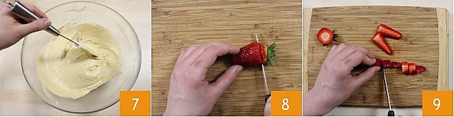 Continuad mezclando con una espátula hasta obtener una mezcla homogénea y suave 7. Lavate las fresas, quítales los tallos y córtalas en trozos (8-9).