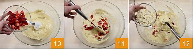 Añadid las fresas a la masa de los muffins 10, dad una mezclada 11 y por último añadid las almendras laminadas 12. Recordad reservar un puñado tanto de fresas como de almendras para la decoración final.