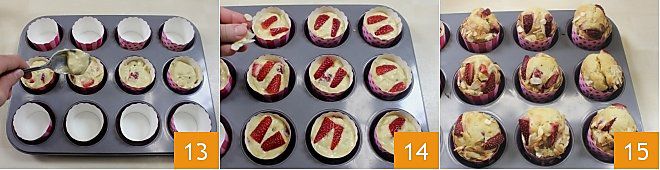 En un molde para muffins, colocad las cápsulas y llenadlas hasta 3/4 de su altura con la masa 13; añadid un par de trozos de fresas y laminas de almendras en la superficie de cada muffin 14 y hornead los muffins de espelta en el horno ya caliente a 180° durante 20-25 minutos (si es horno con ventilación a 160° durante 15-20 minutos). Sacad los muffins de espelta con fresas y almendras del horno 15, dejadlos enfriar sobre una rejilla y ¡servidlos!