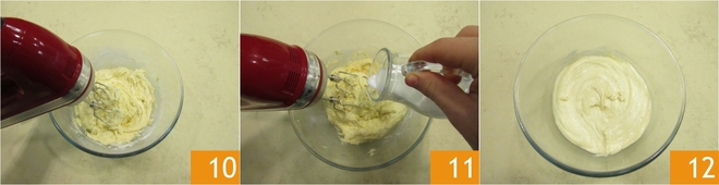 Añadid también una pizca de sal y poned nuevamente en funcionamiento las varillas para incorporar los ingredientes secos 10. Notaréis que la masa se volverá más consistente, así que diluidla con la leche a temperatura ambiente vertida en hilo 11. En este punto, la mezcla será suave y compacta 12.