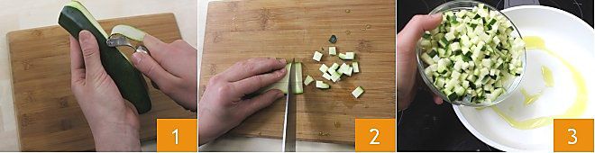 Para preparar los muffins salados con ricotta y calabacines, lava y seca bien los calabacines, quítales los extremos y, con la ayuda de un pelador, obtén 12 rodajas finas que reservarás para la decoración 1. Corta en cubos muy pequeños los calabacines restantes 2 y ponlos a cocinar, a fuego bajo, en una sartén antiadherente con un poco de aceite de oliva virgen extra 3.